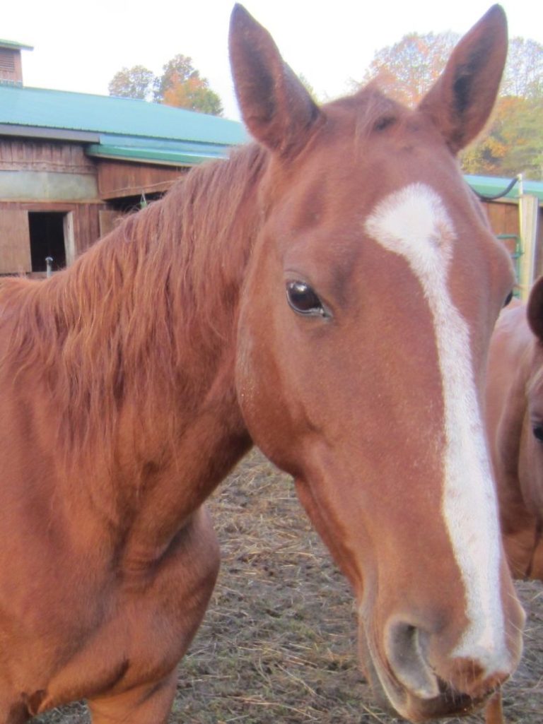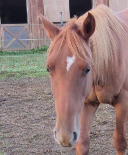 Kasie, a dark chestnut Quarter Horse/Belgium mare, arrived at Centaur Stride as a 4 month old in 1994. Aside from some outside training experiences, she has spent her life as a lesson horse, carrying all kinds of riders over the years. Happy on the trails, she did therapy riders, beginner lessons, and has taught many a rider the canter. She has been known to smile(curl her top lip up) for treats. She is currently enjoying retirement. Thank you Kasie for your faithful service!