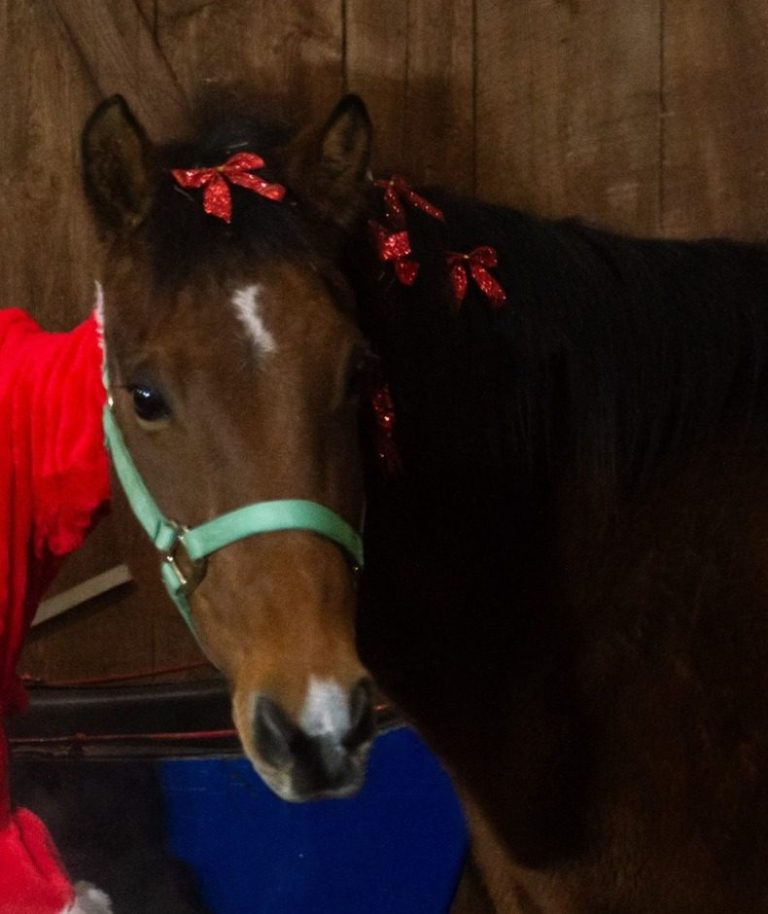Blossum was purchased in May 2025 and has really enjoyed her time here. She is a spook proof sweetheart that doesn't let anything bother her. She even loved Santa and his sleigh in our 2025 Christmas event.
